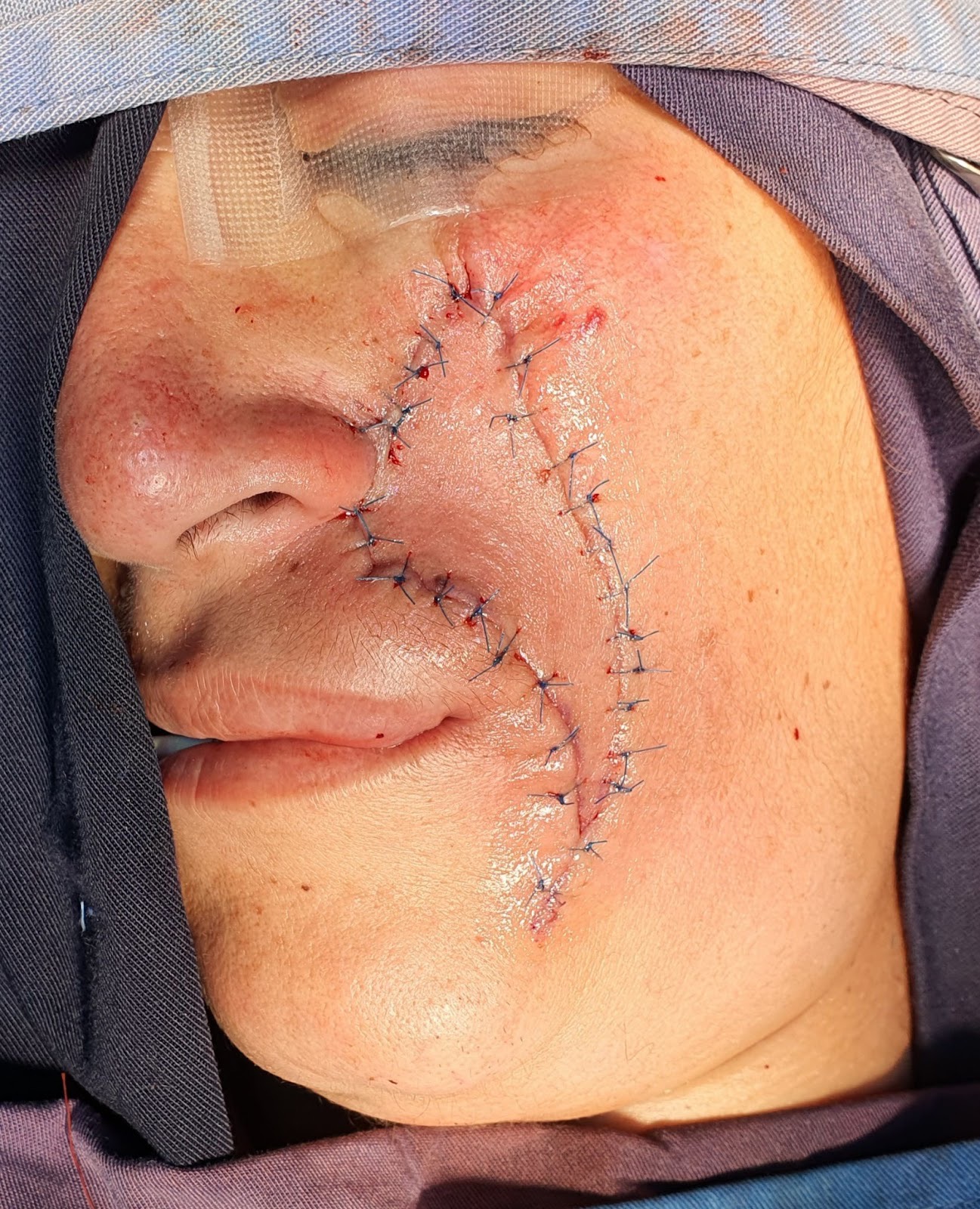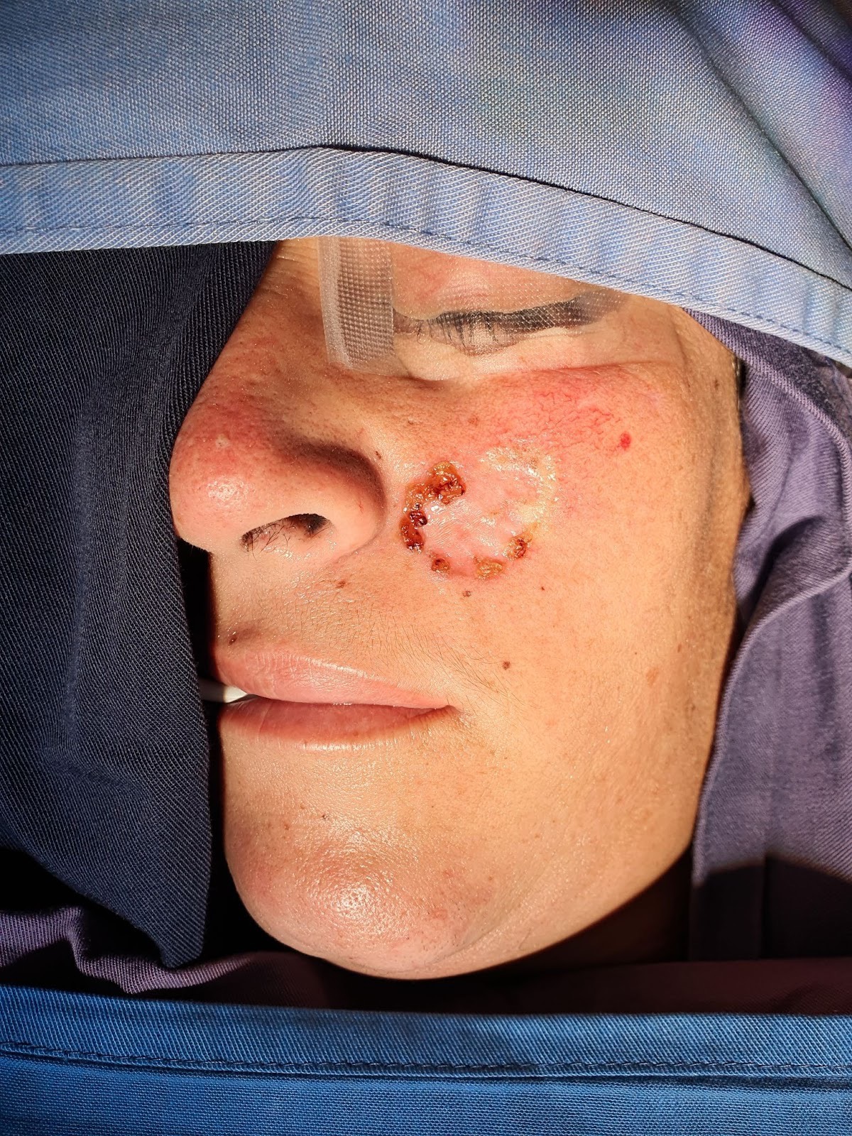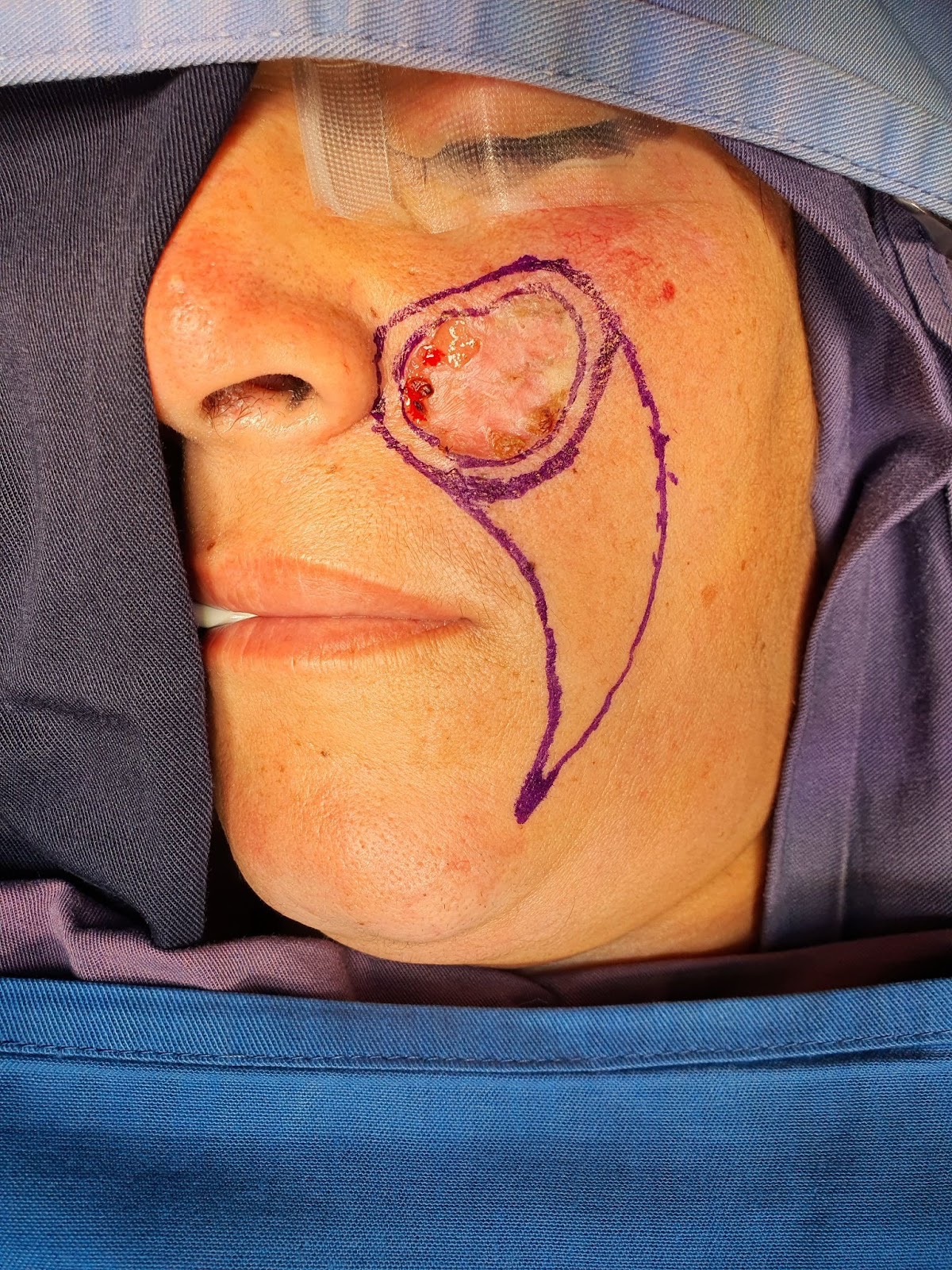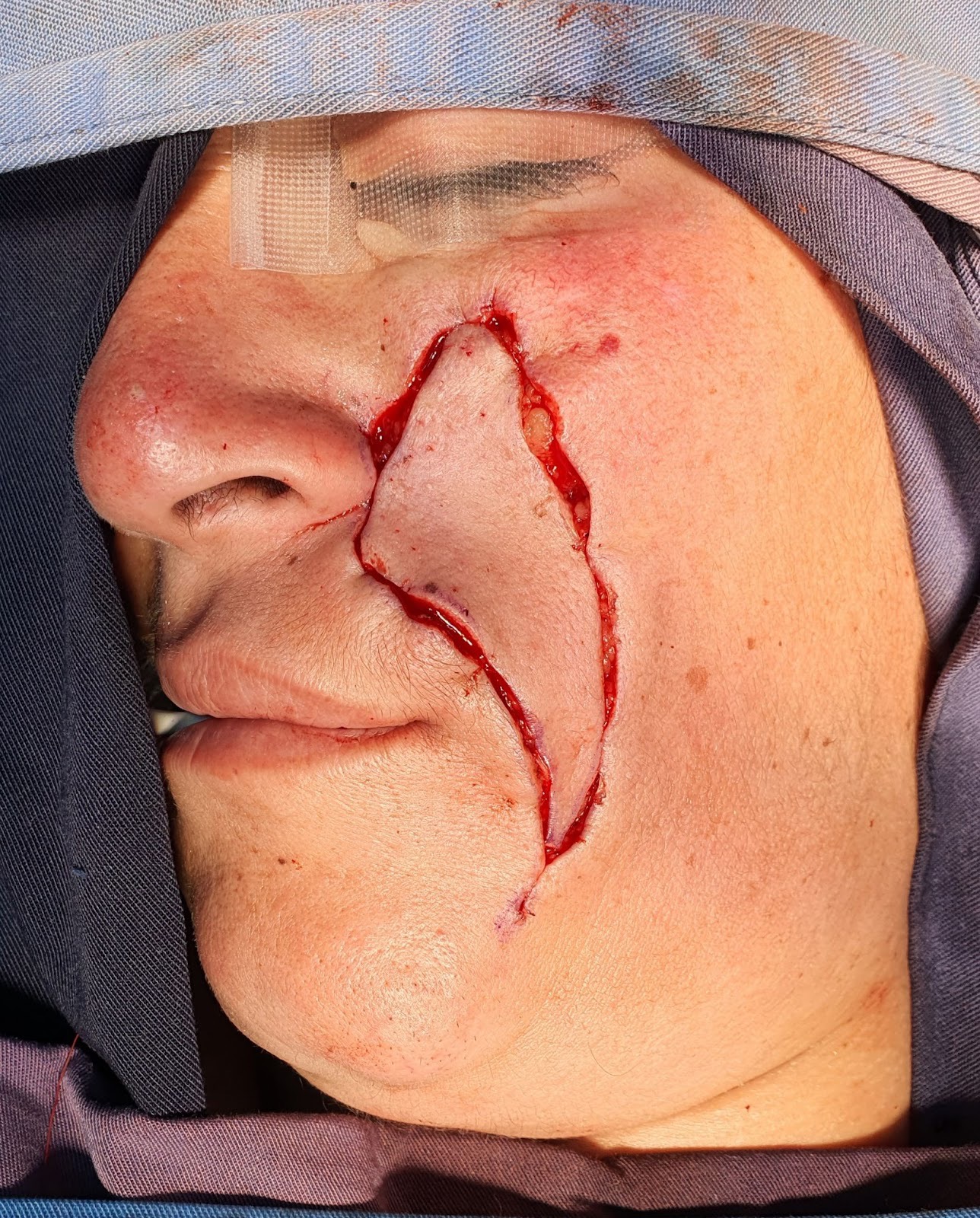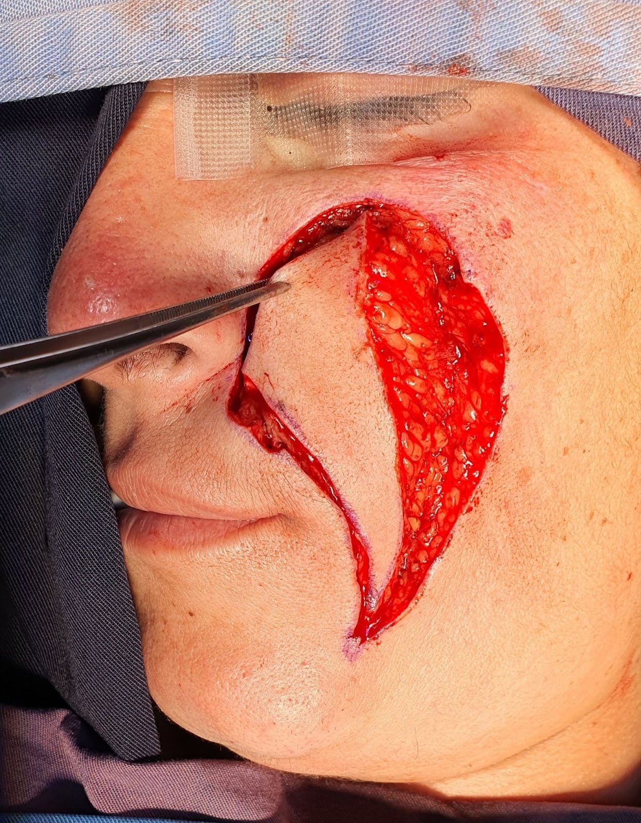 The tumor was marked with a sterile pen making sure adequate safe oncological surgery margins. Simultaneously, the melo-labial advancement flap was designed to cover the defect A #15 blade was used to place an incision around the tumor followed by excision using monopolar cautery set at 10W. Bipolar has been used to control small bleeders. The incisions placed at the marked medial and lateral borders of the flap and dissection proceeded by undermining and elevating in a subcutaneous plane while maintaining a pedicle of subcutaneous fat attached to ensure a robust blood supply. The dissection plane remains superficial to the facial muscles. All the bleeders need to be identified and cauterized before final closure. Once the flap is advanced in a tension free manner, the closure was done in layers using Vicryl 4-0 and Prolene 5-0.