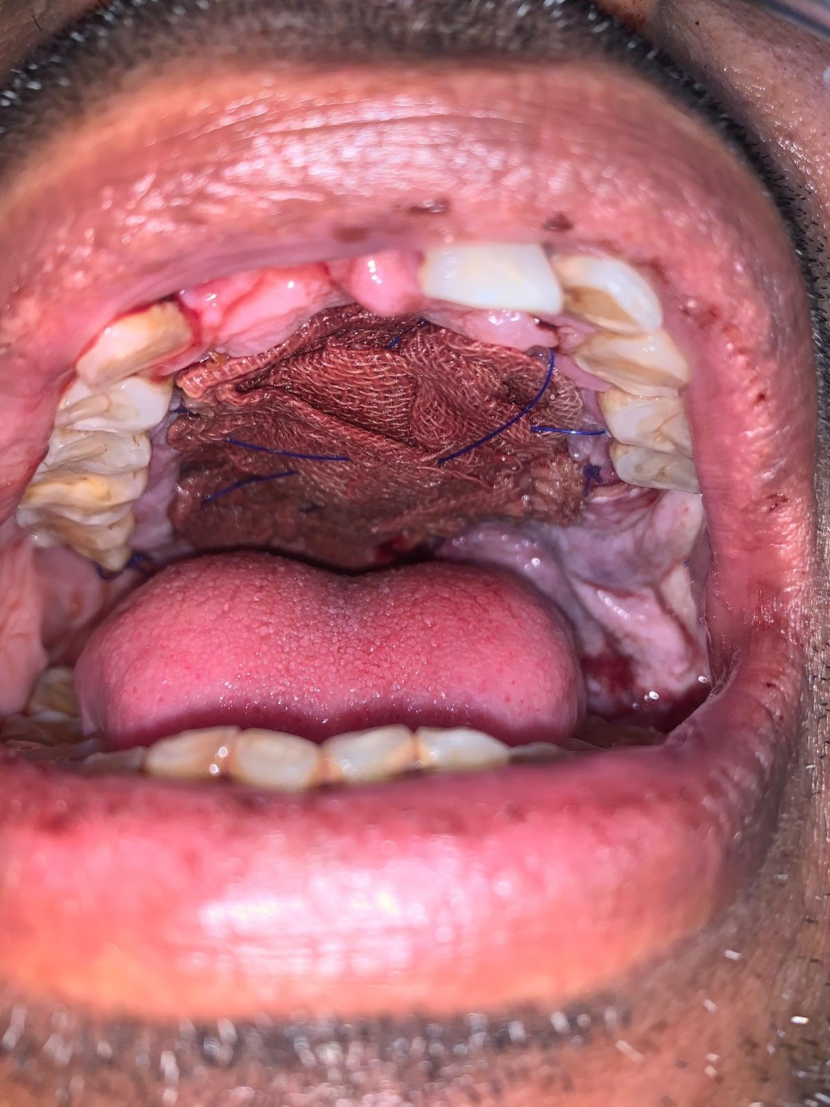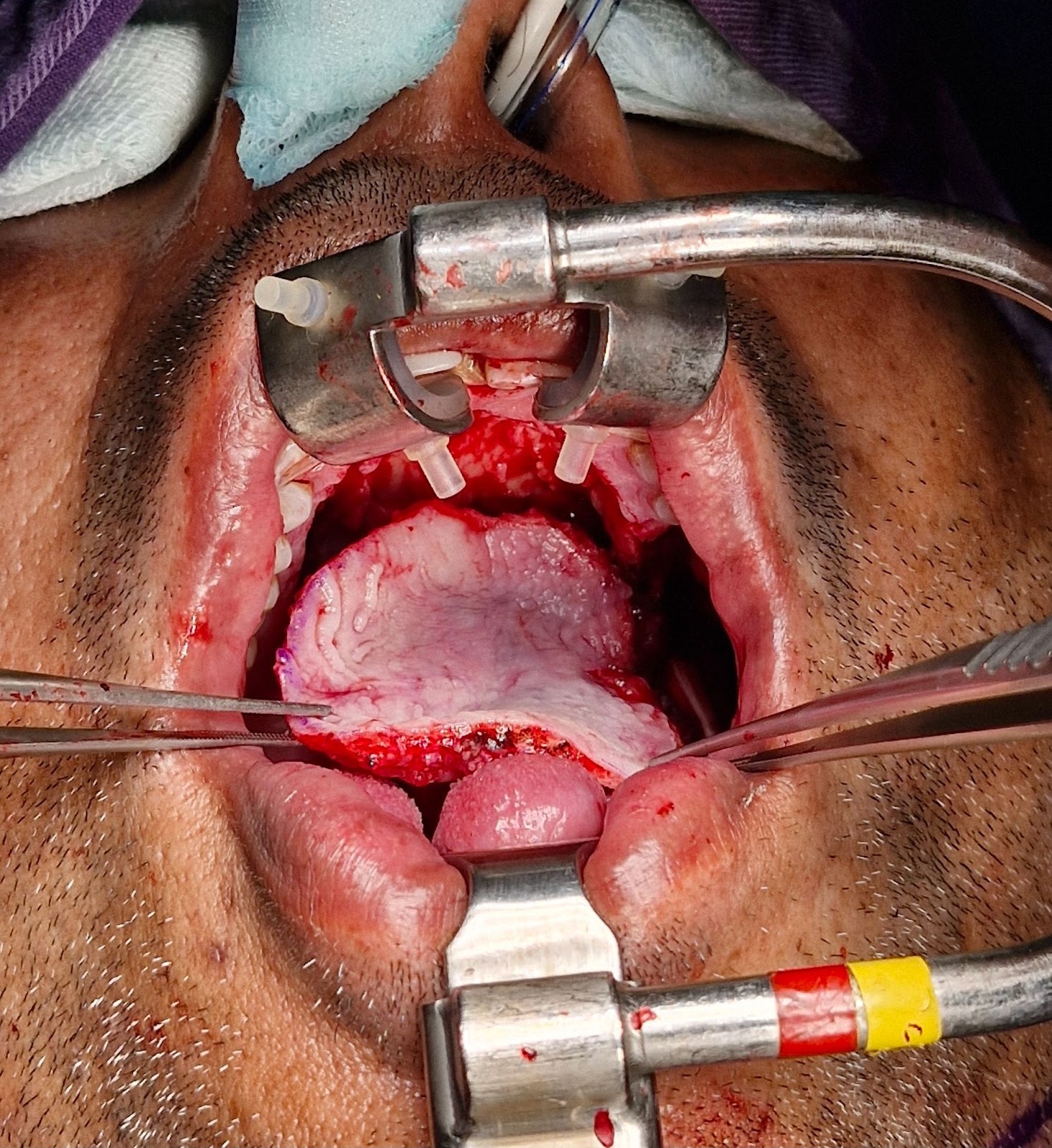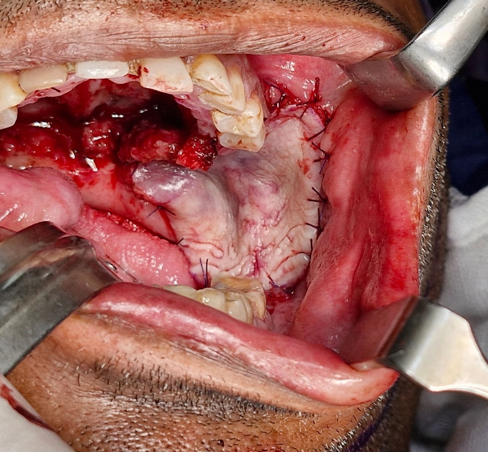 The biopsy proven tumor (SCC) at left retromolar trigione was excised with adequate margins resulting in a defect approximately 3 x 2.5 cm. A sterile marker was used to mark the incisions sparing 5 mm of attached mucoperiosteum. Incision was placed using # 15 blade upto the bone depth and mucoperiosteal flap was raised starting from the contralateral side and towards the vascular pedicle. Posterior releasing incision is made to release the flap for tension free rotation into the defect. Once adequately released, the flap is rotated to cover the defect and secured using Vicryl 4-0 suture. The donor site exposed bone was covered with White Head Varnish (WHV) pack and secured in place using prolene 3-0 suture.