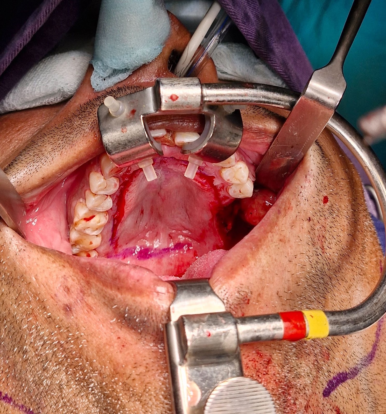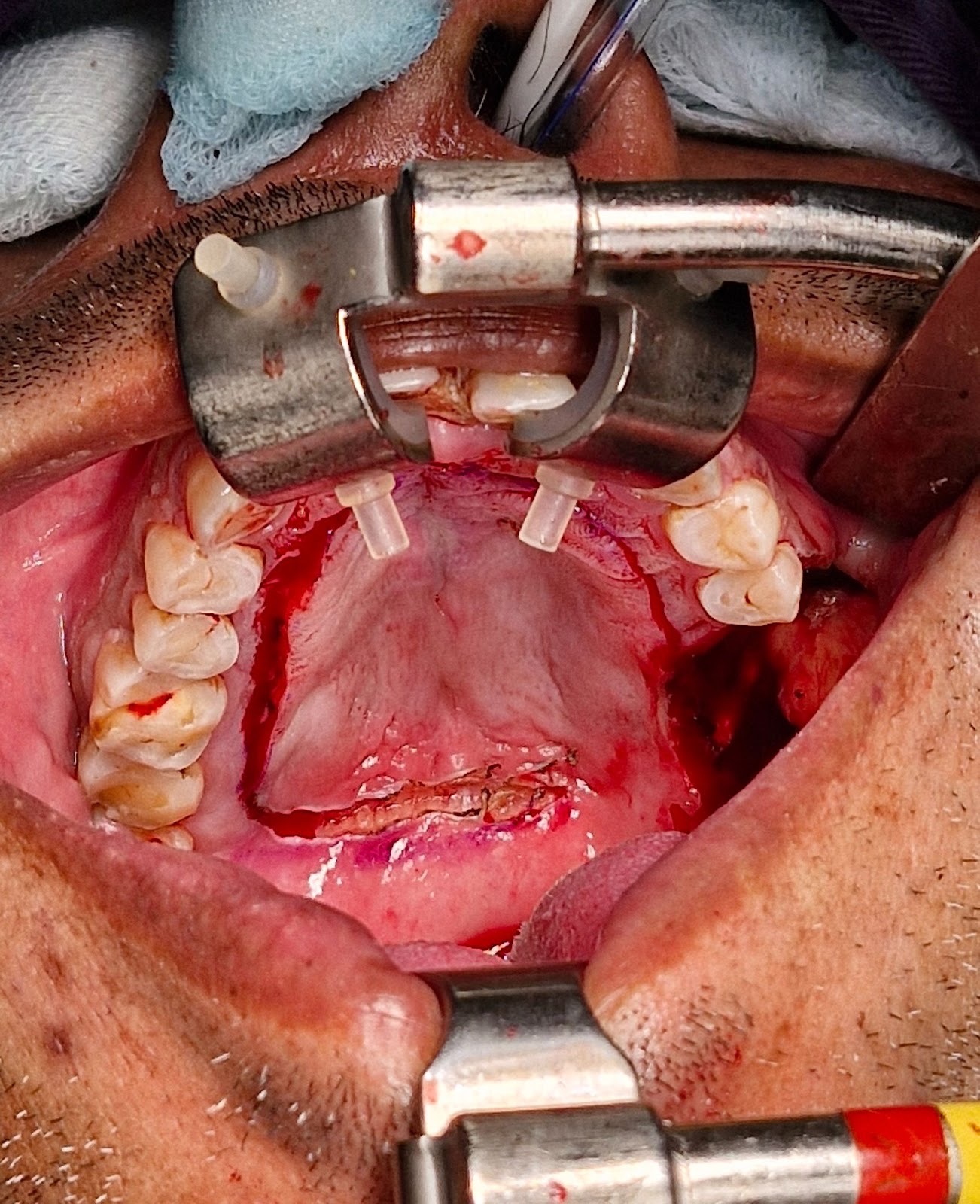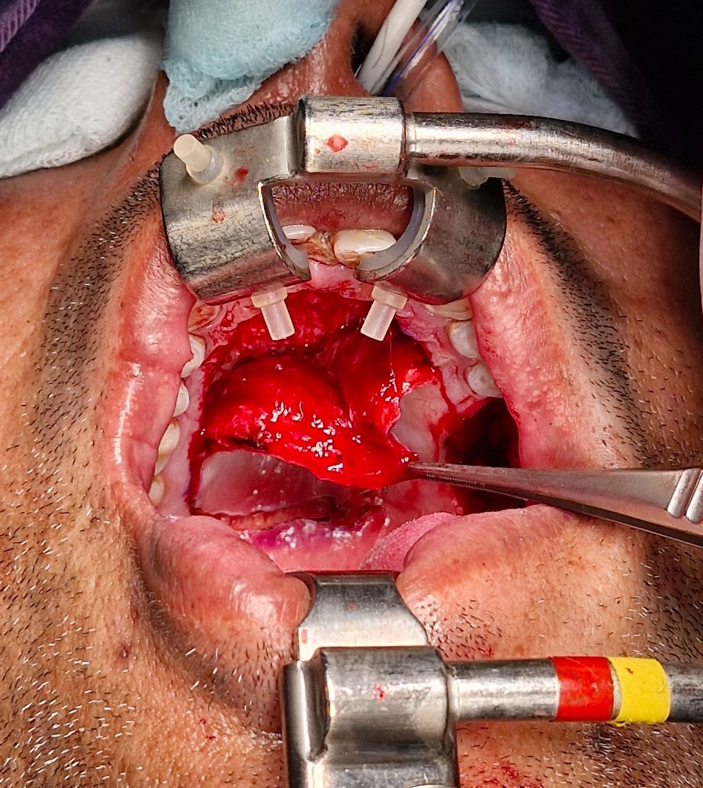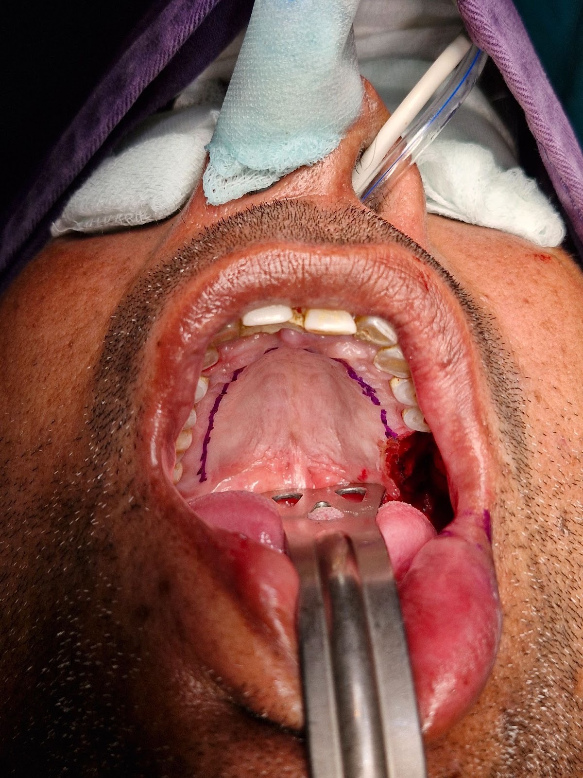 The biopsy proven tumor (SCC) at left retromolar trigione was excised with adequate margins resulting in a defect approximately 3 x 2.5 cm. A sterile marker was used to mark the incisions sparing 5 mm of attached mucoperiosteum. Incision was placed using # 15 blade upto the bone depth and mucoperiosteal flap was raised starting from the contralateral side and towards the vascular pedicle. Posterior releasing incision is made to release the flap for tension free rotation into the defect. Once adequately released, the flap is rotated to cover the defect and secured using Vicryl 4-0 suture. The donor site exposed bone was covered with White Head Varnish (WHV) pack and secured in place using prolene 3-0 suture.